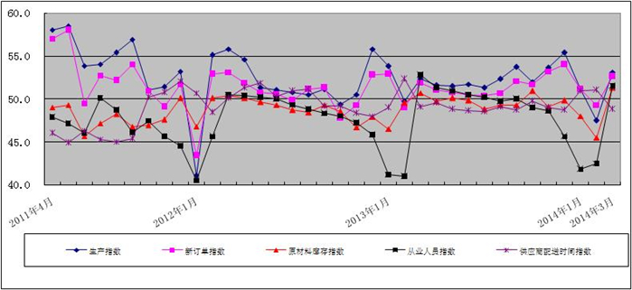 图2 2011年4月-2014年3月广东省重点企业PMI分项指数趋势图