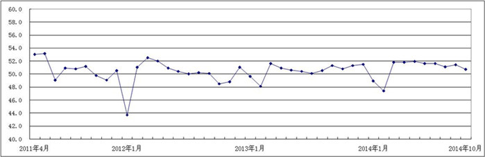 图1 2011年4月-2014年10月广东省重点企业PMI趋势图