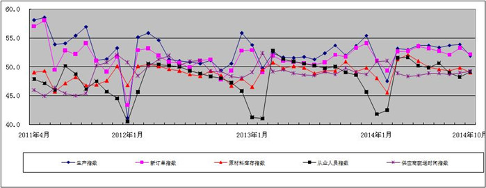 图2 2011年4月-2014年10月广东省重点企业PMI分项指数趋势图