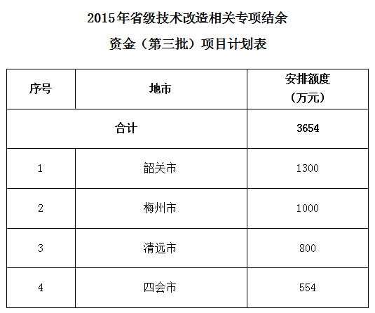 为认真贯彻落实省委省政府工作部署,紧紧抓住广东新一轮技术改造的发展机遇,围绕扩产增效、设备更新、智能化改造等投资方向,激活存量,做实增量,主动承接珠三角产业梯度转移,不断加大投资力度,促进山区经济平稳发展,加快产业转型升级。经请示省领导同意和公示无异议后,现将2015年省级技术改造相关专项结余资金(第三批)3654万元下达给韶关、梅州、清远、四会市。具体安排如下:
