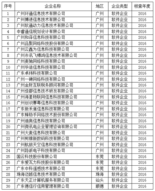 经材料核查及现场抽查,广州环通信息技术有限公司等30家企业2016年度符合49号文规定的软件企业条件,现将名单公示如下: