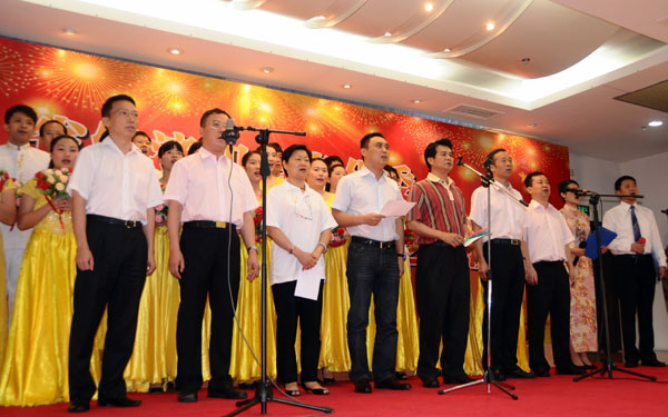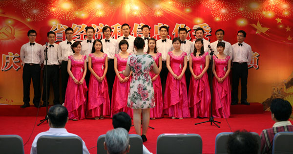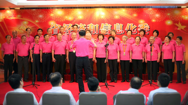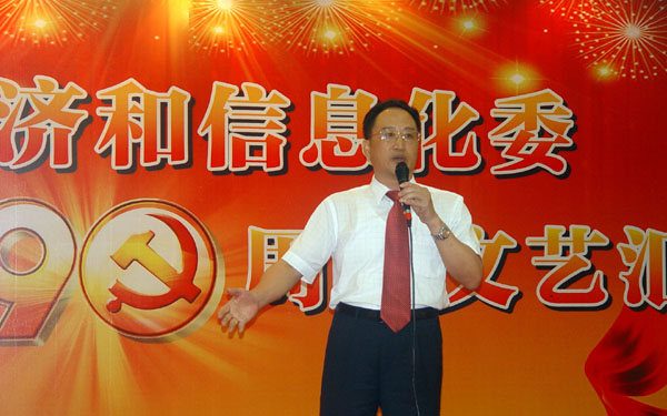党组书记、主任杨建初发表了热情洋溢的致辞。在家的委领导,离退休老干部、机关处室负责同志和直属(代管)单位主要领导纷纷带头登台演出。如毕志坚副主任带领机关党办、节能和循环经济处、军工处、离退休人员管理处演唱《工农兵联合起来》;林位超副主任、孙鮀生副巡视员、姚德洪总经济师带领工业园区处、原材料工业处、消费品工业处演唱《大海啊,故乡》,许振嘉纪检组长带领监察室表演舞蹈《红旗颂》;原省经委副主任、离休干部杨开茂及委机关离退休老干部们演唱《共产党来恩情长》、《夕阳红》、《没有共产党就没有新中国》;省黄金公司党委书记王喜明、总经理郑健华带队演唱《广东黄金之歌》;委机关信息中心主任邹林华带队表演《为了谁》。
