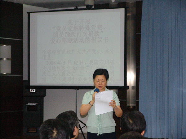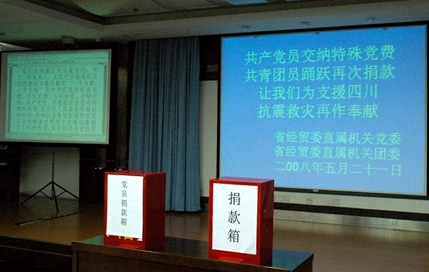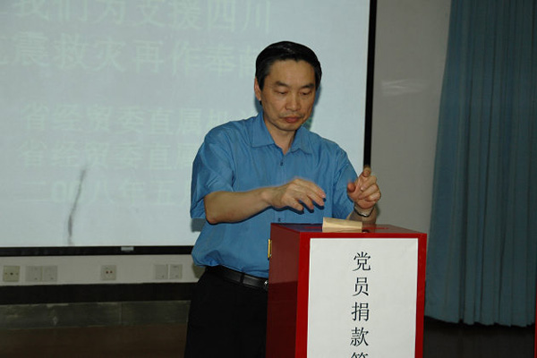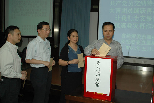 省经贸委副主任毕志坚在捐款现场的讲话中指出,灾情发生后,省经贸委立即响应党中央、国务院和省委、省政府的救灾部署,成立了以党组书记、主任杨建初同志为组长的委抗震救灾领导小组及三个专项工作组,紧急启动应急方案;委党组向全省经贸系统发出了迅速动员组织广大基层党组织和党员干部投入抗震救灾工作的通知,要求全省经贸系统立即行动,全力支援四川抗震救灾。从14日起,委机关和直属单位以及部分委管协会广大干部职工,踊跃捐款表达爱心,至