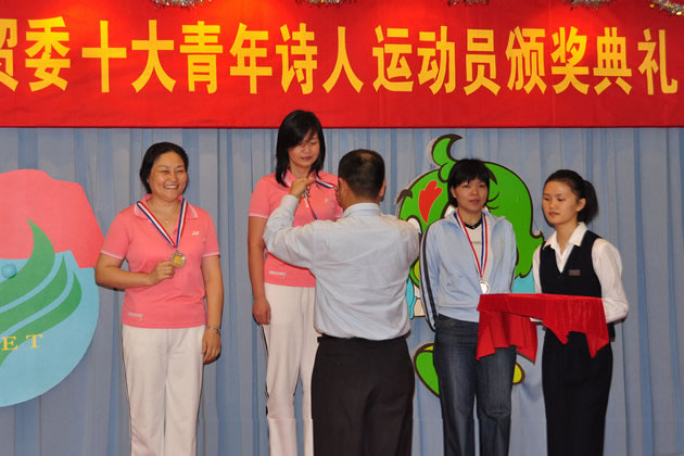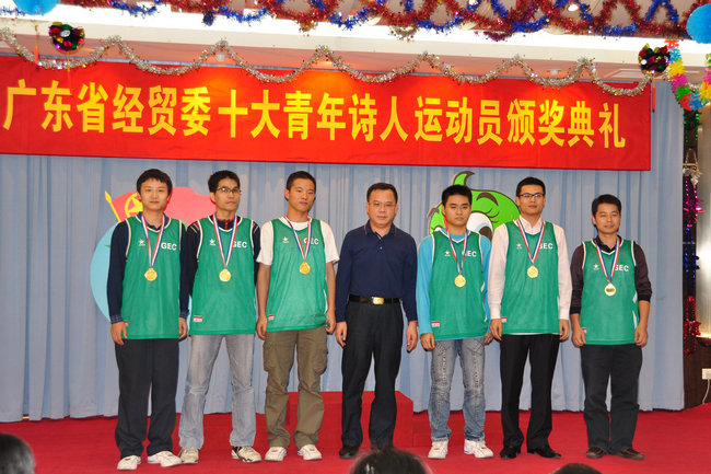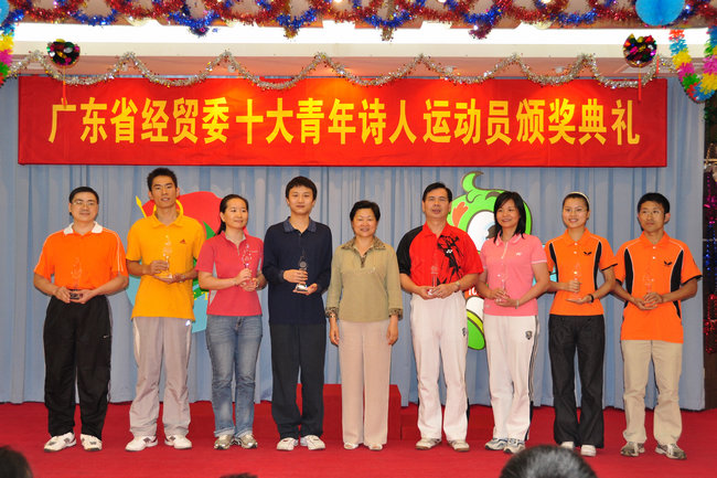 随后,颁奖嘉宾依次为十大青年诗人、十大运动员、运动会各项比赛的冠亚季军、课题调研前三名和省直机关青年岗位能手颁发奖杯、证书和奖牌。宋晶、胡兴华、卢振港、王克满、陈科、姚瑞婷、王婧、钟旗珈、傅妍敏、肖振宇荣获“省经贸委十大青年诗人”称号,宋晶《奥林匹克中华赋》荣获最佳主题诗歌,胡兴华《乡村五月天》荣获最佳非主题诗歌。张国凯(篮球)、洪蒙纳(男子羽毛球)、陈玉芳(女子羽毛球)、曾润志(男子乒乓球)、伍妙婵(女子乒乓球)、陈伟川和叶凤萍(扑克)、孙青林(中国象棋)、郁大忠(围棋)、刘巨强(毽子)、梅家春(登山)荣获省经贸委十大运动员称号。机关团支部《广东省产业转移的集聚发展路径调研报告》(指导:姚德洪;执笔:王婧、杨淑鹏、郑华、易贤辉),《省经贸委团建工作调研报告》(指导:刘俊兴;执笔:卢振港、张娜、陈科),博览团支部《韩资企业在华投资经营现状调查报告》(指导:汪盛波、冯志祥;执笔:林熹、杨小文、邓华)荣获课题调研前三名。