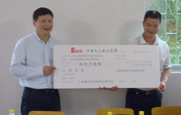 杨主任代表省经济和信息化委在会上向红桥村委捐赠30万元支票,一批书籍、医药和桌椅板凳,他表示,省经济和信息化委高度重视扶贫开发工作,专门召开委党组扩大会议讨论相关帮扶问题,制订了《广东省经济和信息化委员会扶贫开发“规划到户责任到人”工作实施方案》。他强调扶贫开发“规划到户责任到人”工作是省委省政府改善民生,促进区域、城乡协调发展的重大战略决策,省经济和信息化委作为省政府综合经济部门,将按照省委省政府的工作要求,尽最大努力将工作做好,使帮扶到位,力争取得优异成绩。