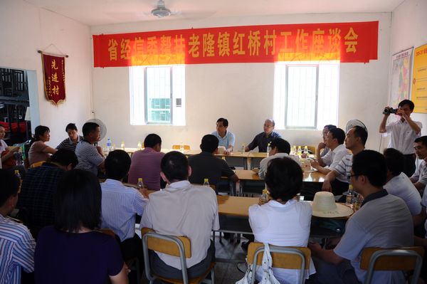 在工作座谈会上,邹生副主任听取了村、镇以及驻村工作组对扶贫开发工作的汇报。邹生副主任指出,新的驻村工作组进驻以来,在全委机关处室单位、县镇村各级干部的大力支持下,我委对口红桥村的扶贫开发“规划到户、责任到人”工作进展顺利,村容村貌发生了崭新变化。今年是完成扶贫开发“双到”工作关键之年,大家思想上要高度重视,行动上要积极主动,尽快推进落实各帮扶项目。在产业帮扶方面,要建立长效的肉猪、蔬菜销售机制,确保产业帮扶出效果;在村容村貌整治方面,启动“明亮红桥”工程,铺设节能路灯,建设垃圾池,提升农村卫生水平。同时,还要加快红桥村农村信息化进程,将农村信息化惠及全村,并用信息化手段,推进红桥村乡村文化建设。