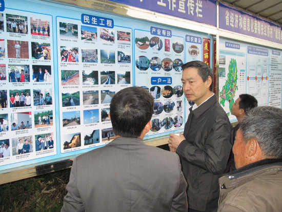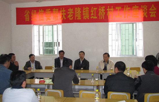 最后,戚真理巡视员一行在村委会和村干部、驻村工作组以及县、镇有关干部座谈。在座谈中,戚真理巡视员指出,在驻村工作组的努力下和县、镇、村干部的支持下,红桥村村容村貌一年来发生了巨大变化。目前,国家和省都高度重视扶贫开发工作,国家刚召开完中央扶贫开发工作会议,省政府就组织召开了扶贫开发“双到”工作现场会,我们要深入贯彻中央扶贫开发工作会议精神和省政府扶贫开发“双到”工作现场会议精神,认清形势任务,深入推进我委扶贫开发各项工作。要注重可持续发展,研究建立长效扶贫开发机制;要加快推进收购村三级水电站项目,进一步提高村集体经济收入,发展村公益事业和加大对特困户的救济力度;要充分调动村民、村里乡贤参与全村扶贫开发工作的积极性,进一步统筹资源推进各项工作;要深入推进“一户一法”,确保所有贫困户达到脱贫目标;要做好村容村貌整治,进一步提升全村整体形象;要做好今年扶贫开发“双到”工作总结,及时向委党组书面汇报各项工作成效和进展情况。