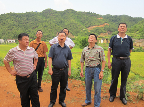 7月9日,曾健、姚德洪一行来到葛藤村,在驻村工作组和镇、村干部的陪同下,顶烈日冒酷暑,边走边看,先后到村委会办公楼建设工地、饮水工程水源地、油茶种植基地等项目现场进行考察。