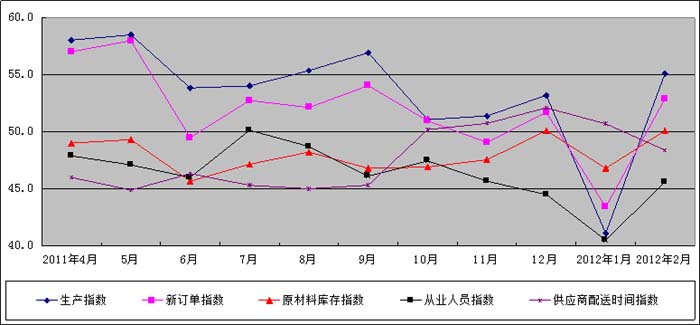 图2 2011年4月-2012年2月广东省重点企业PMI分项指数趋势图