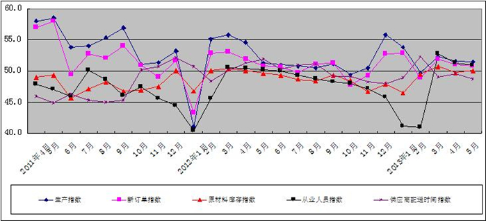 图2 2011年4月-2013年5月广东省重点企业PMI分项指数趋势图