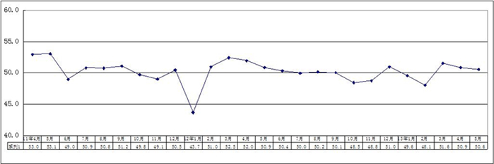 图1 2011年4月-2013年5月广东省重点企业PMI趋势图