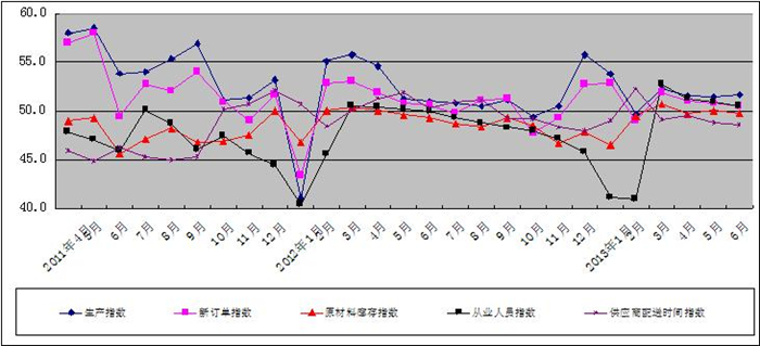 图2 2011年4月-2013年6月广东省重点企业PMI分项指数趋势图