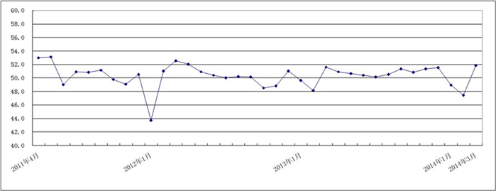 图1 2011年4月-2014年3月广东省重点企业PMI趋势图