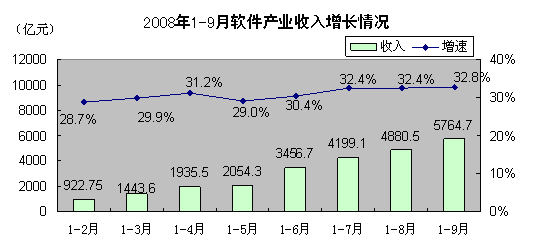 1-9月,我国软件产业继续保持快速增长的态势,累计完成软件业务收入5764.7亿元,同比增长32.8%,增速比去年同期高9.2个百分点,比1-6月高出2.4个百分点。