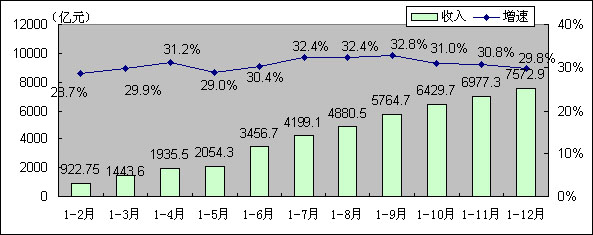 2008年,我国软件产业保持快速增长的态势,累计完成软件业务收入7572.9亿元,同比增长29.8%,增速比上年同期高8.3个百分点。四季度起,行业收入增速出现小幅回落,10月底累计增速比三季度下降1.8个百分点,11月比10月、12月比11月又分别下降0.2和1个百分点,。
