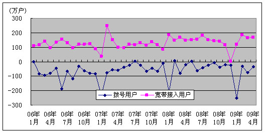 3.互联网用户:基础电信企业的互联网用户进一步趋向宽带化。1-4月份,基础电信企业净增互联网宽带接入用户639.7万户,达到8982.1万户,而互联网拨号用户减少了395.6万户。
