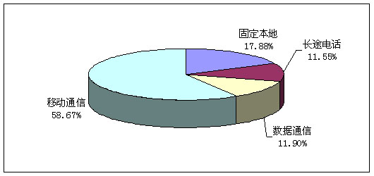2009年1-4月,移动通信收入和数据通信收入比上年同期分别增长10.5%和7.6%,在电信主营业务总收入中所占的比重比上年同期分别上升了4.48和0.62个百分点。而长途电话业务收入和固定本地电话业务收入比上年同期分别减少12.6%和13.3%,在电信主营业务总收入中所占的比重比上年同期分别下降了1.93和3.16个百分点。