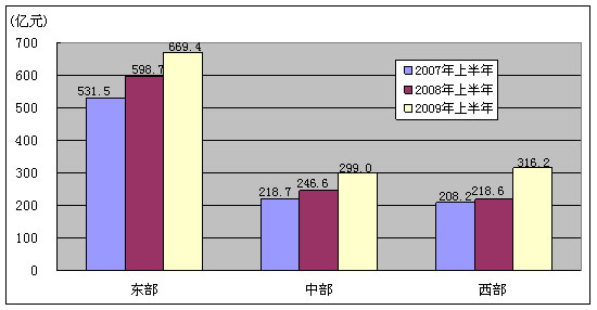 图8. 2008-2009年同期东、中、西部电信主营业务收入