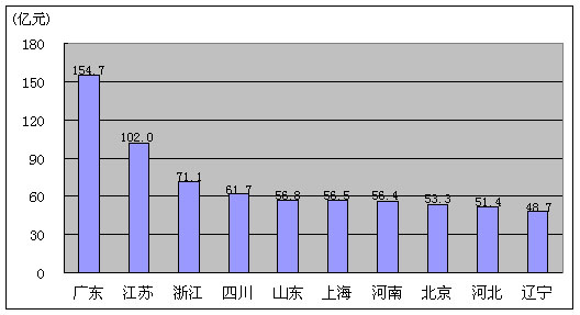 图12. 2009年上半年电信主营业务收入排名前十名的省份