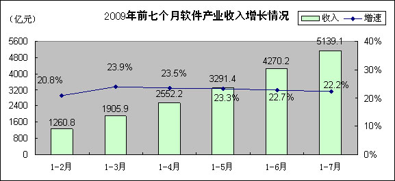 1-7月,软件产业累计完成软件业务收入5139亿元,同比增长22.2%,增速比1-6月和一季度分别回落0.6和1.7个百分点,比去年同期低10.2个百分点。