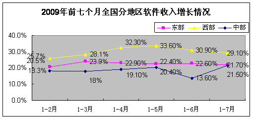 1-7月,东部地区累计完成软件业务收入4419.8亿元,占全国的86%,同比增长21.7%,增速比去年同期下降12.1个百分点,比1-6月降低0.9个百分点;西部地区累计完成软件业务收入422亿元,同比增长29.1%,增速比去年同期高出5.2个百分点;中部地区累计完成软件业务收入279.4亿元,同比增长21.5%,增速比去年同期下降1.7个百分点。