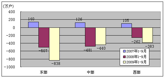 图9. 2007-2009年同期东、中、西部净增固定电话用户