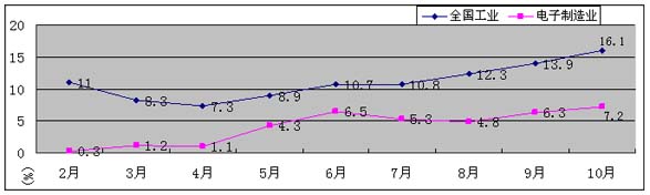 图1 2009年1-10月规模以上电子信息制造业与全国工业增加值月度增速对比