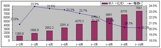 三、软件业务收入保持平稳发展态势。1-10月,软件产业累计完成业务收入7691.2亿元,同比增长20.2%,增速比1-9月低0.1个百分点,比去年同期低10.8个百分点。10月当月完成软件业务收入916亿元,同比增长19.7%,增速比8、9月份分别上升6.3和4.1个百分点,比去年同期高2.5个百分点。软件服务化趋势明显,软件技术服务收入1662.6亿元,同比增长26%。从重点省市看,江苏省增长27.3%,广东省增长12.1%,上海市增长15.2%,北京市增长15.9%。