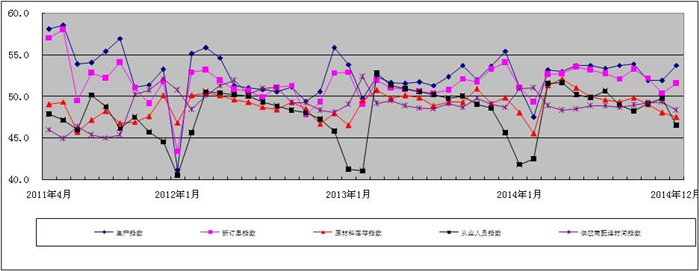 图2 2011年4月-2014年12月广东省重点企业PMI分项指数趋势图