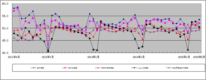 图2 2011年4月-2015年5月广东省重点企业PMI分项指数趋势图