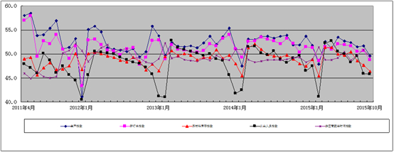 图2 2011年4月-2015年10月广东省重点企业PMI分项指数趋势图