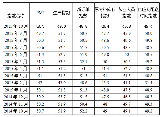 表1 2014年10月-2015年10月广东省重点企业PMI主要分项指数值表
