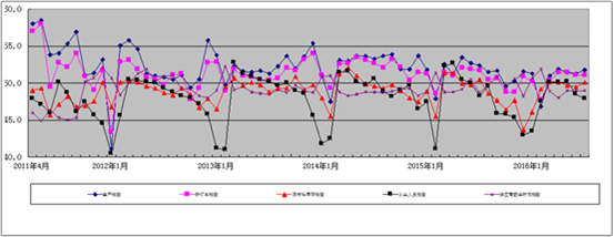 图2 2011年4月-2016年7月广东省重点企业PMI分项指数趋势图