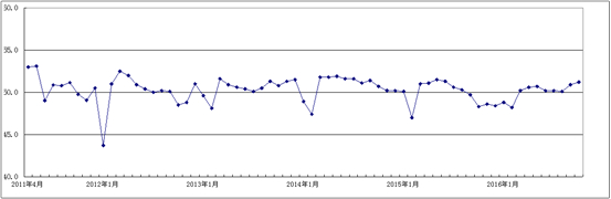 图1 2011年4月-2016年10月广东省重点企业PMI趋势图