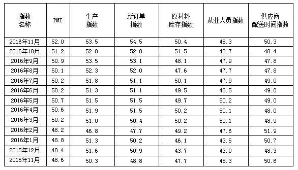 表 2015年11月-2016年11月广东省重点企业PMI主要分项指数值表
