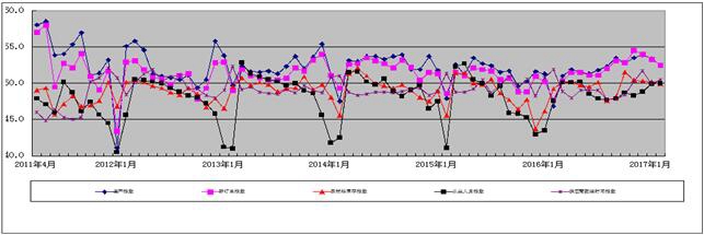 图2 2011年4月-2017年2月广东省重点企业PMI分项指数趋势图