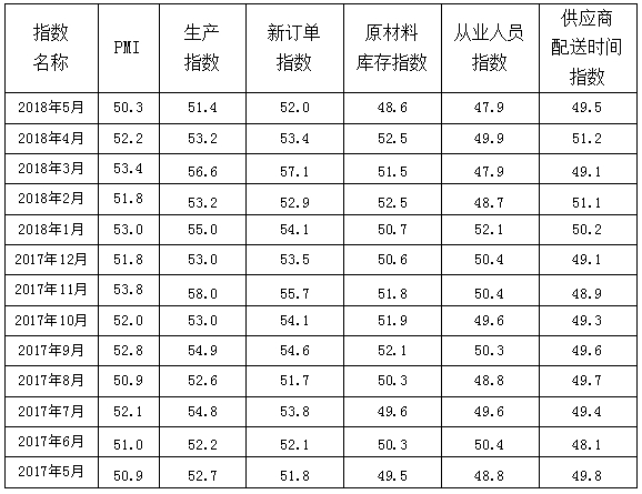 表 2017年5月-2018年5月广东省制造业PMI主要分项指数值表
