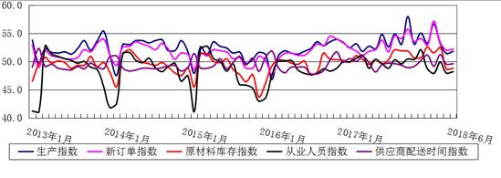 图2 2013年1月—2018年6月广东省制造业PMI分项指数趋势图