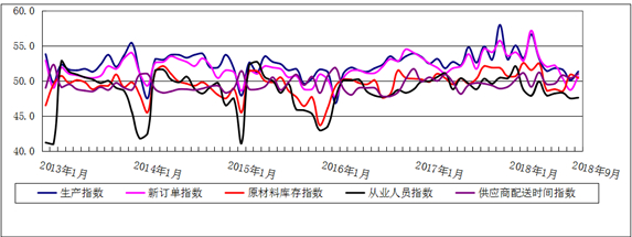 图2 2013年1月—2018年9月广东省制造业PMI分项指数趋势图