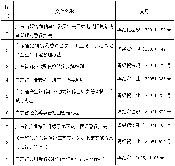 根据《广东省行政机关规范性文件管理规定》(省人民政府93号令),省经济和信息化委对其及原广东省经济贸易委员会制定的规范性文件进行了清理,决定废止《广东省经济和信息化委员会关于家电以旧换新凭证管理的暂行办法》等9份文件,现予以公布。本《通知》自发布之日起施行。