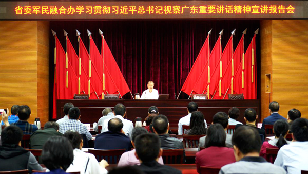12月21日,省委宣讲团成员、买球 党组书记、厅长涂高坤赴省委军民融合办作学习贯彻习近平总书记视察广东重要讲话精神宣讲报告。省委军民融合办副主任林仲雅主持会议。涂高坤从“加深认识、深刻领会、抓好落实”全面系统阐述了习近平总书记视察广东重要讲话的重大政治意义、现实意义和深远历史意义,全面系统解读了习近平总书记关于深化改革开放、推动高质量发展、提高发展平衡性和协调性、加强党的领导和党的建设的一系列重要论述,强调要切实加强学习贯彻习近平总书记重要讲话精神的思想自觉和行动自觉,深刻领会习近平总书记视察广东重要讲话的丰富内涵和精神实质,把思想和行动统一到习近平总书记重要讲话上。涂高坤表示,习近平总书记在庆祝改革开放40周年大会上以及视察广东的重要讲话,是我们高举新时代改革开放旗帜、以新担当新作为把广东改革开放不断推向深入的行动纲领,大家一定要带着感情、带着责任、带着使命抓落实,结合实际、真抓实干,切实用习近平总书记重要讲话精神统一思想、指导实践、引领发展。