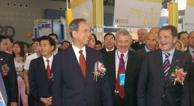 十五日上午,中意联合举办的第三届中国国际中小企业博览会在广州开幕,意大利总理普罗迪与中国国务院副总理曾培炎为博览会剪彩,并参观了意大利馆和中国馆。