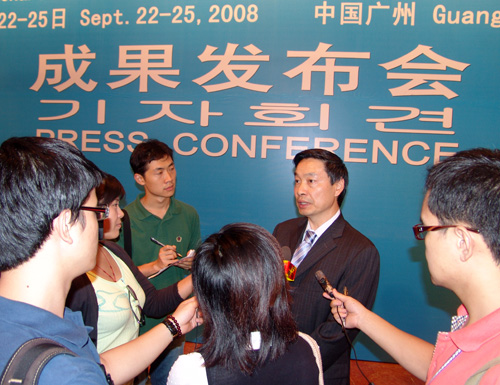 金彰南领事介绍说,韩国政府在中博会期间派遣了中小企业厅洪锡禹厅长以及中小企业厅和外交通商部的政府代表6人;韩国政府正式派遣的政府代表以外知识经济部,驻广州韩国总领事馆 等相关机关 15名官员参加了中博会;韩国中小企业中央会、韩国贸易协会、韩国设计振兴院、大韩贸易投资振兴公社(KOTRA)、韩国国际展示馆(KINTEX)40名相关人员也参加了中博会;此外京畿道议会议员,舆论媒体15名参加了中博会,为了艺术公演,在韩国文化体育观光部的支持下,韩国国立舞蹈团,韩国国立管弦乐团,韩国国立唱剧团派出了总人数为50人的艺术团。总共有305家韩国企业参加了本次中博会,参加人数达到1000余名, 韩国馆共有近500个展位,展示面积1万平方米,韩国馆内设置了“2008韩国设计展——广州”展厅,约80家企业参加了展示。